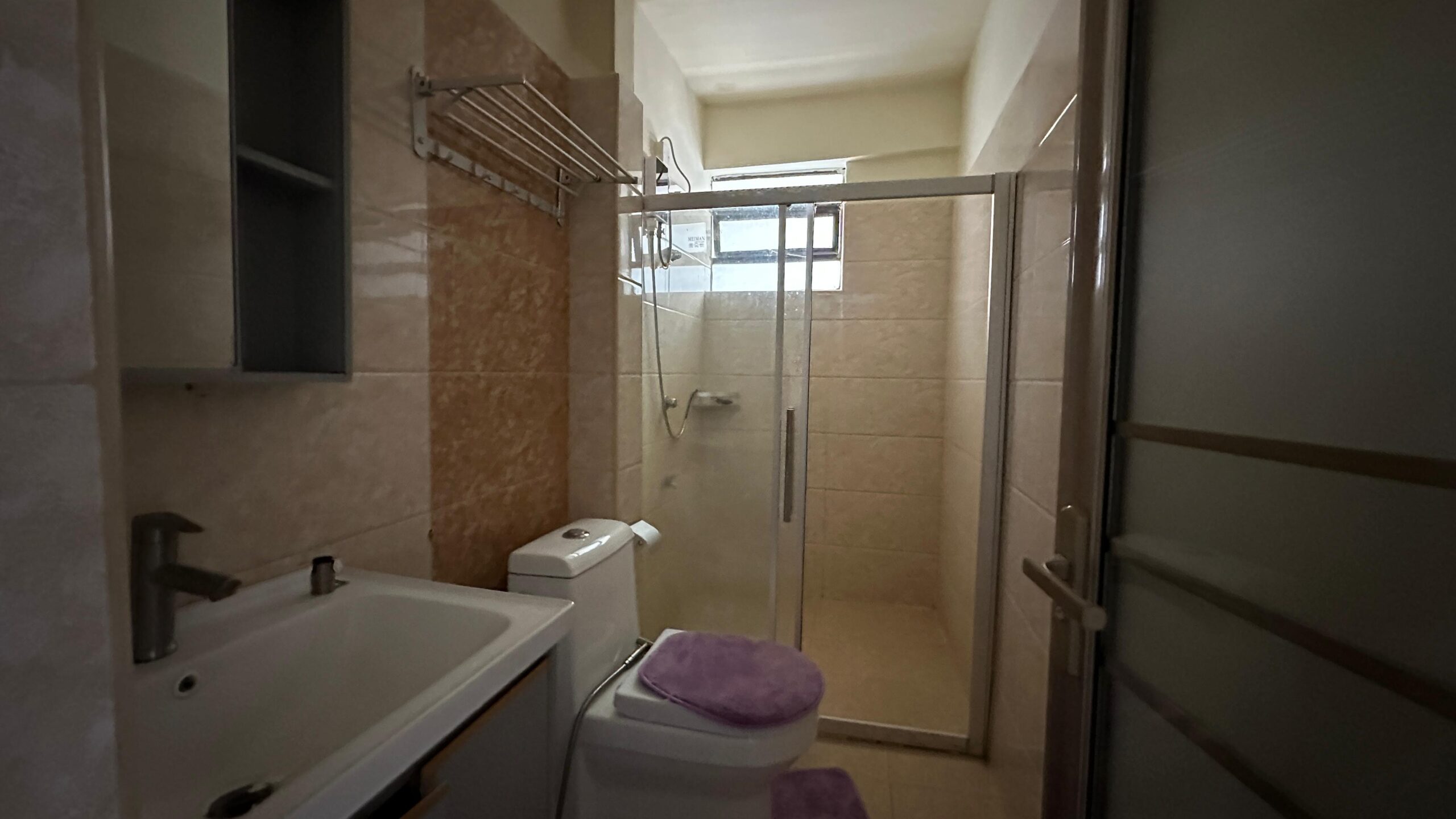 The kitchen is both stylish and functional, offering ample storage and workspace for daily cooking. Moreover, the tiled floors and modern fittings enhance the apartment’s aesthetic appeal, making it ready for immediate occupation.