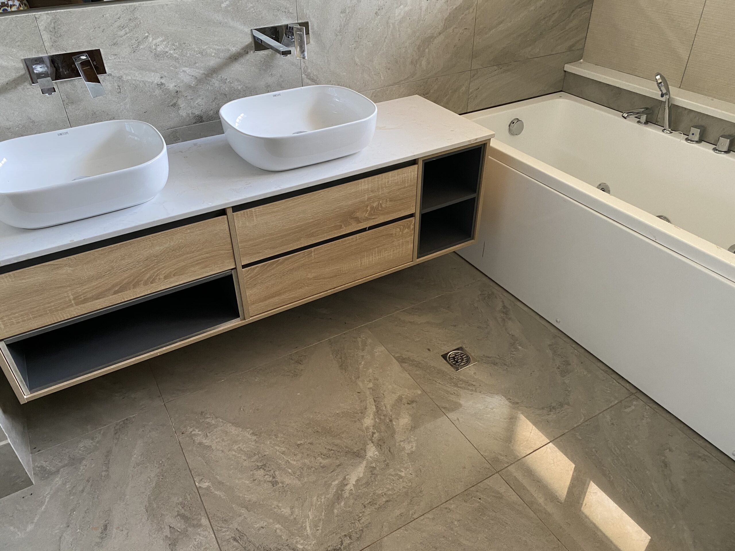 Contemporary bathroom vanities and ample wardrobes